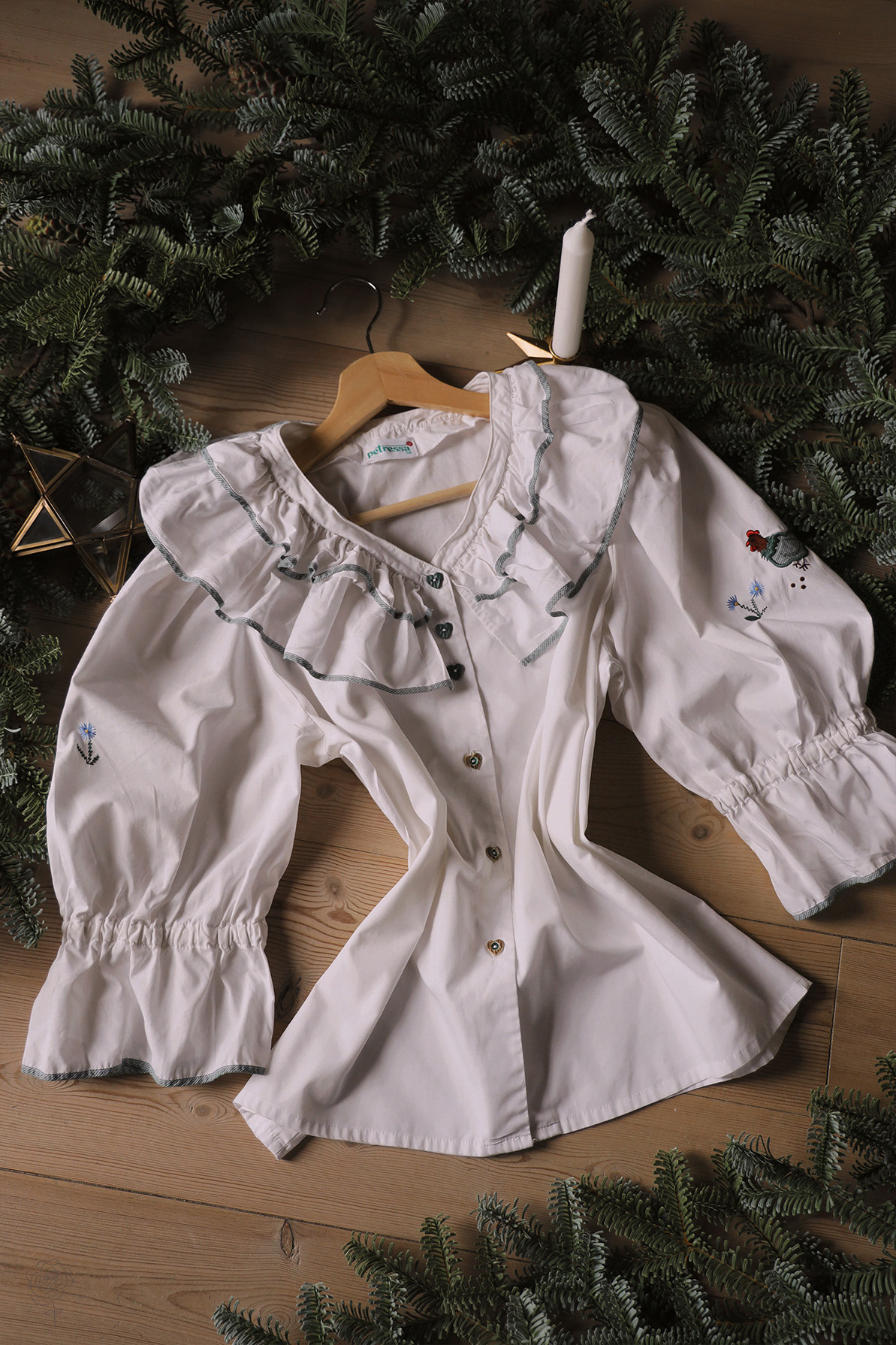 The blouse has puffy sleeves and is in good condition (has a few tiny stains on the collar)