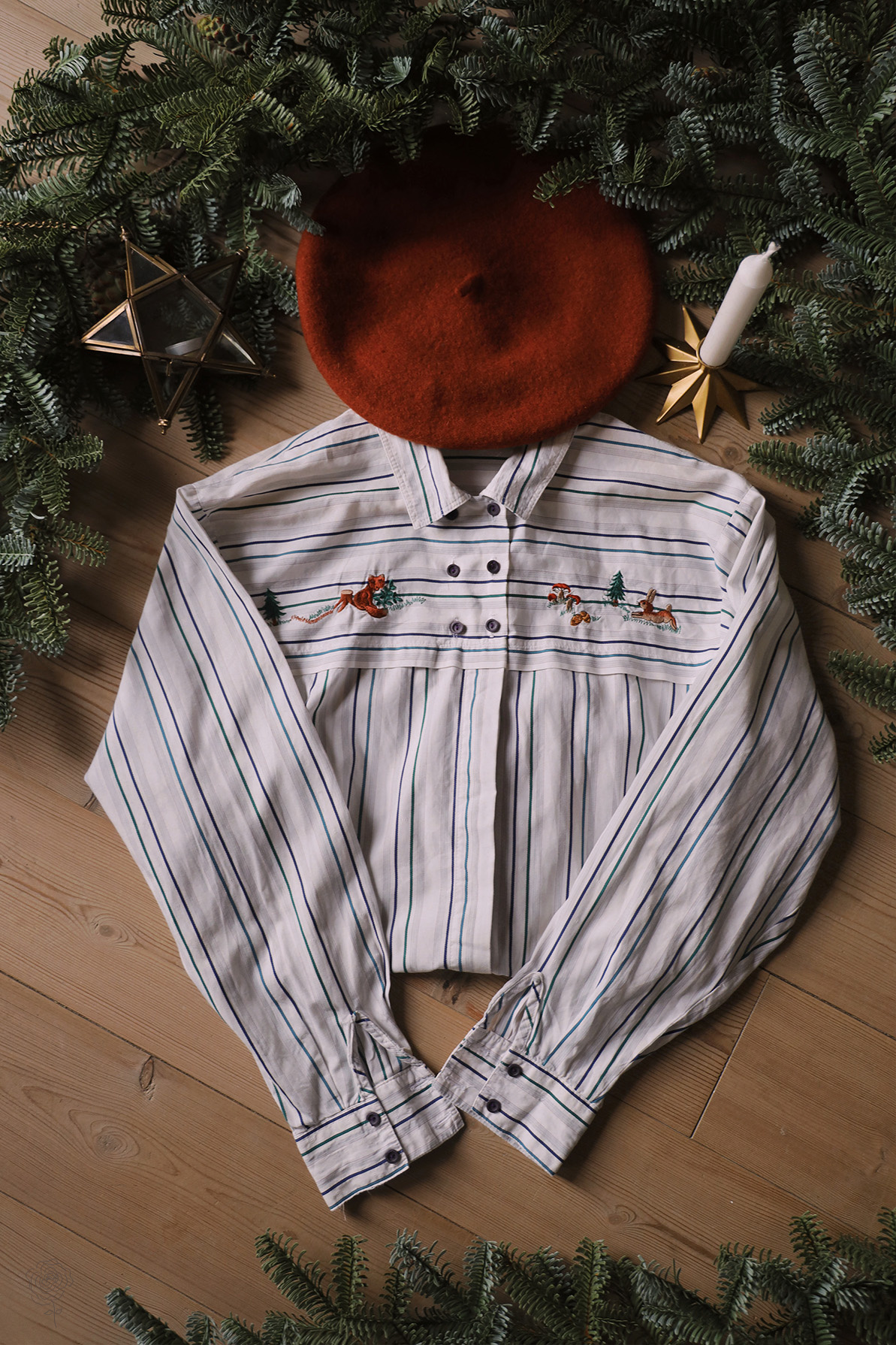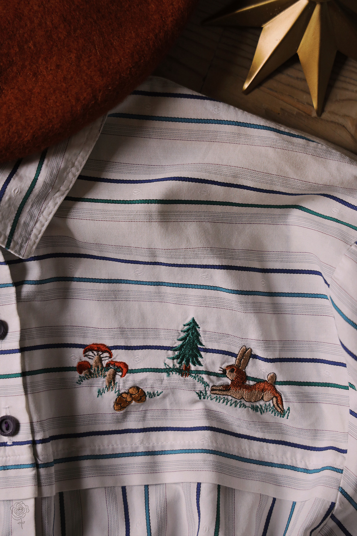 White blue and green striped vintage blouse with animal forest embroideries on the chest