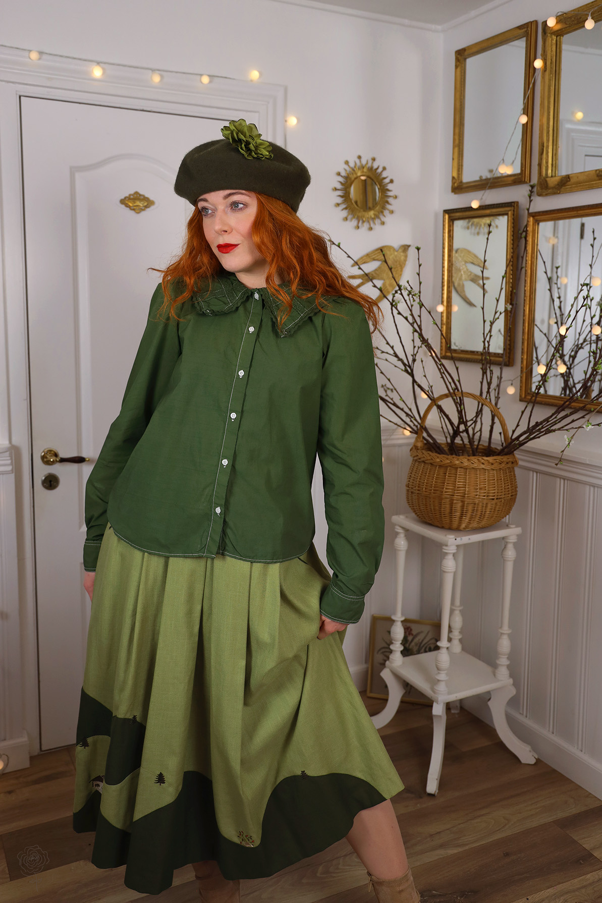 Redyed olive green cotton blouse with a square big collar and buttons down the front