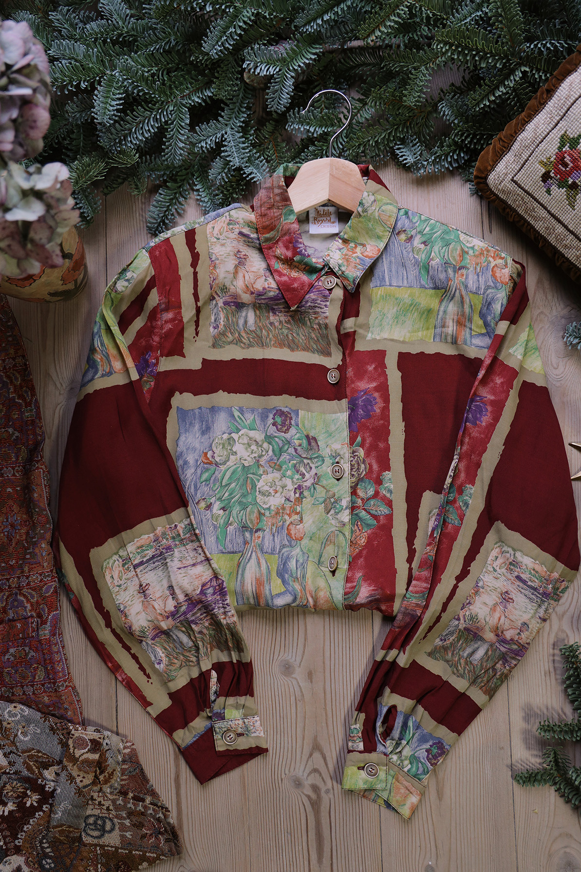 Red artsy vintage blouse from the 80’s, with buttons down the front