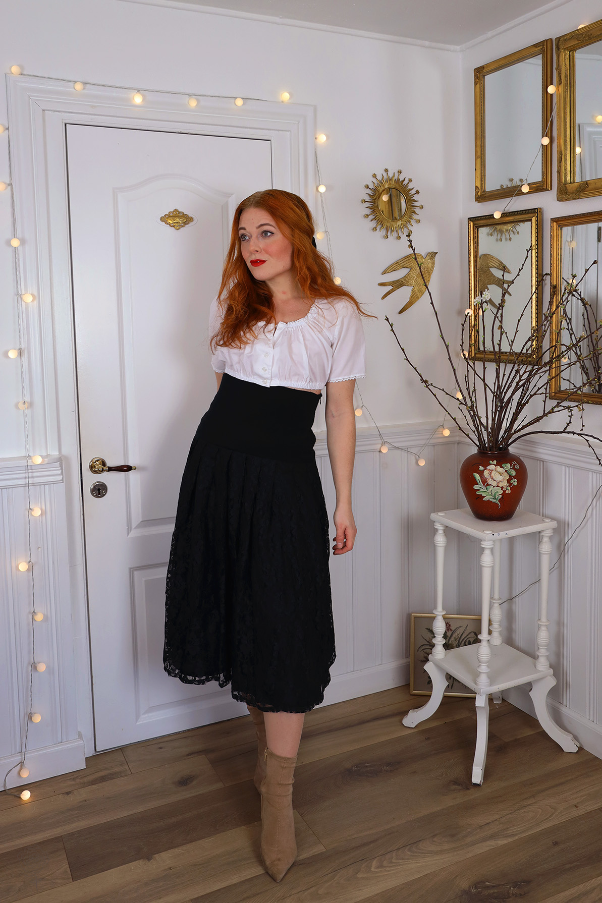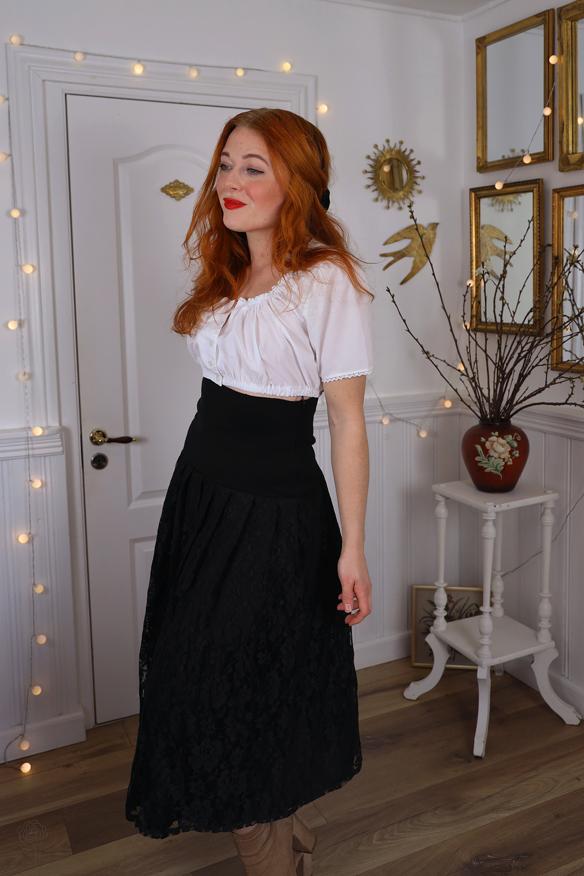 Black lace vintage skirt and white cotton top