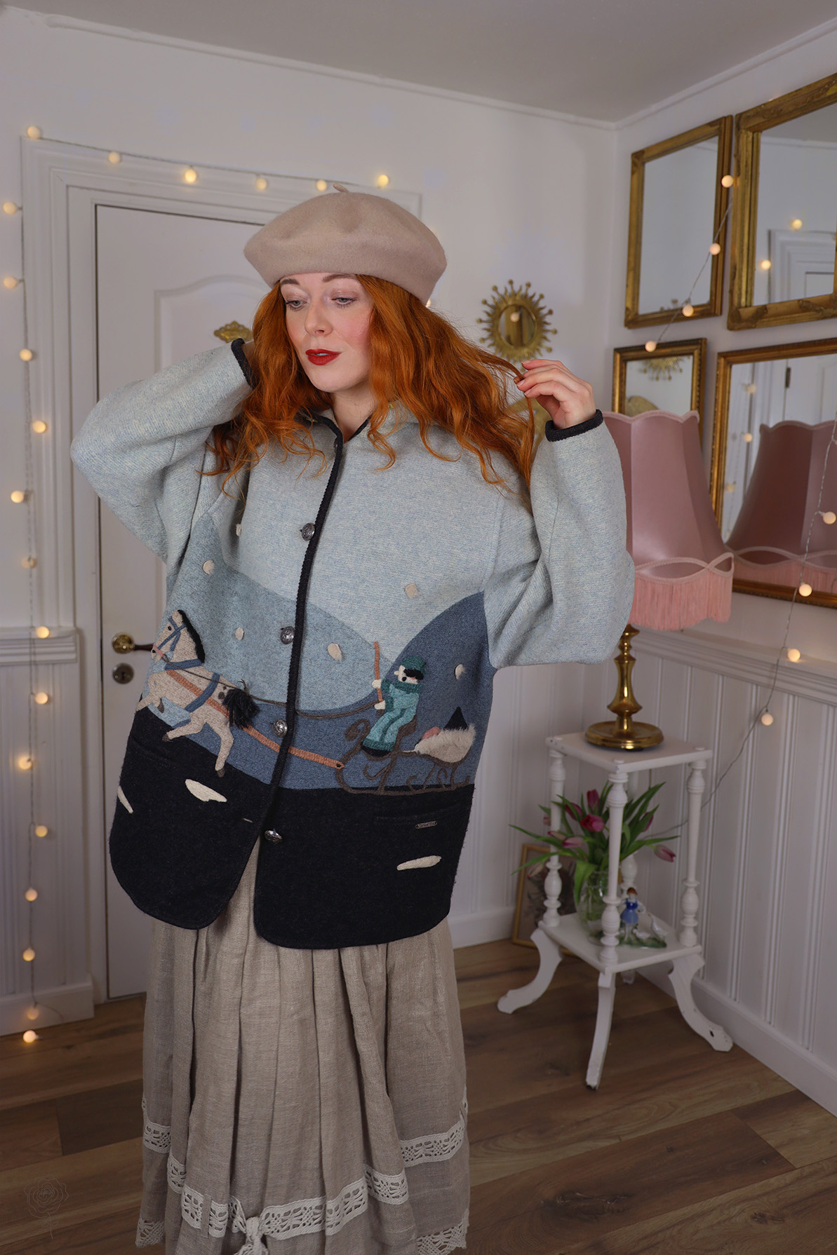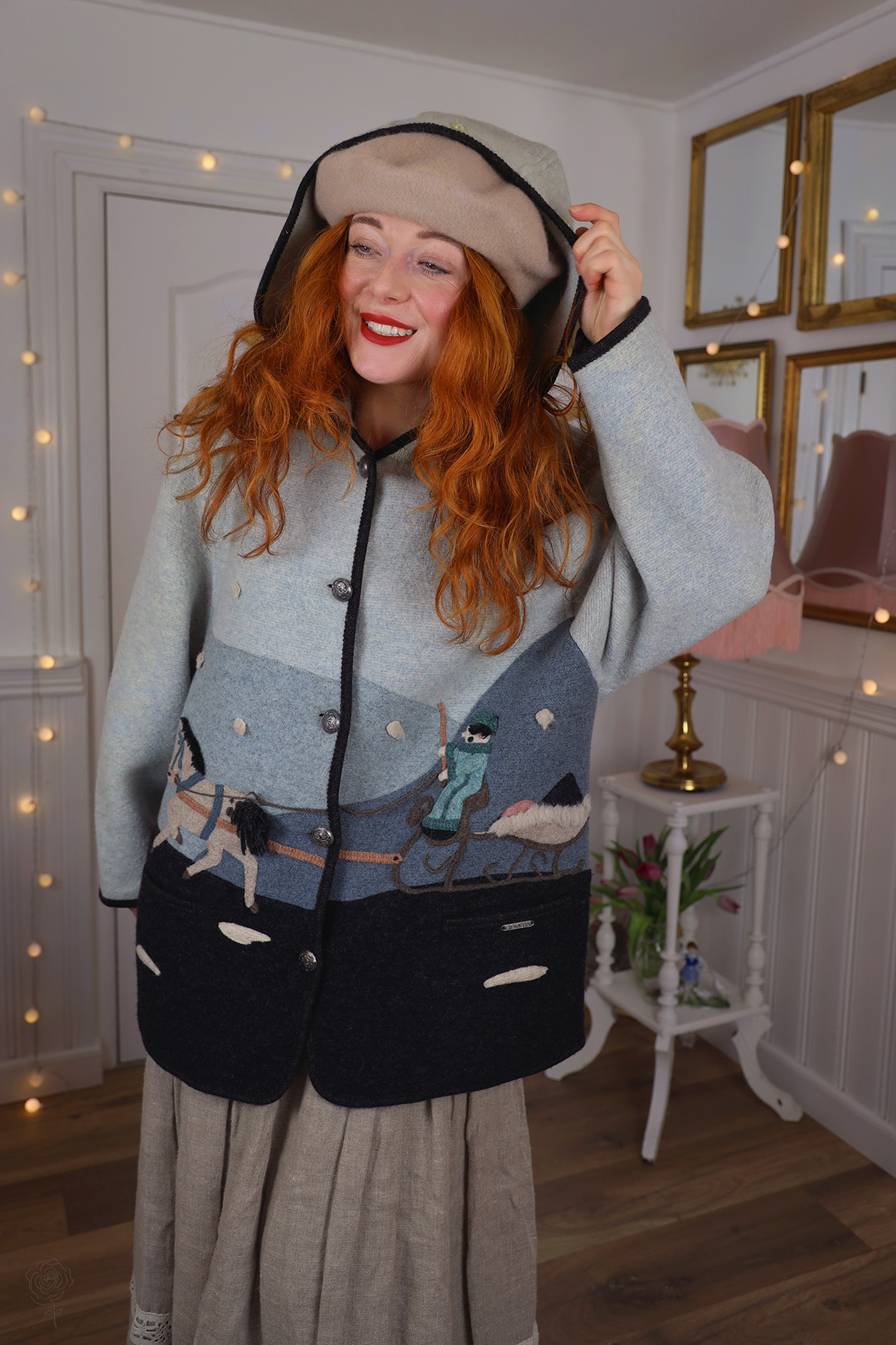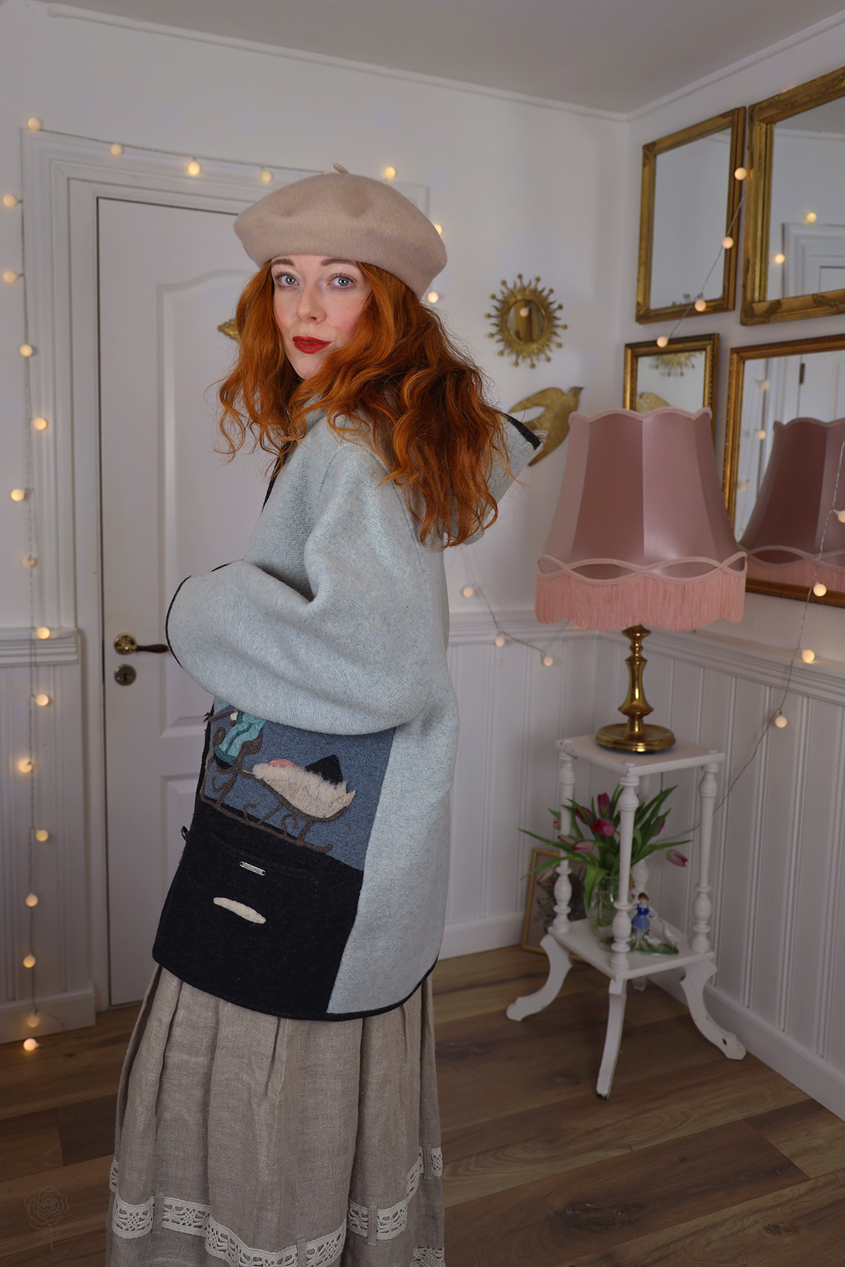 with steel buttons and wonderful details on the front, a horse carriage with a coachman.