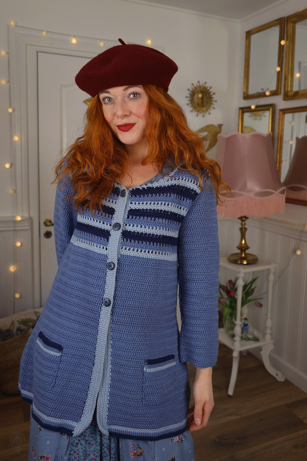 Blue handknitted striped cardigan with pockets on the front and dark blue buttons