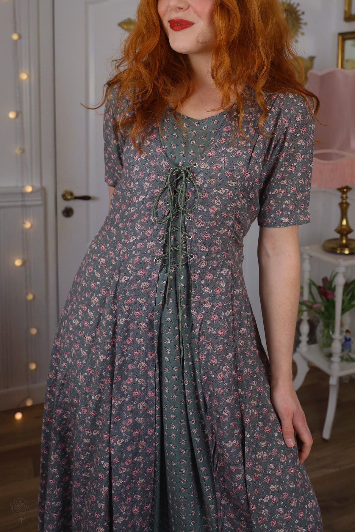 Charming green light pink and plum floral 90’s vintage dress