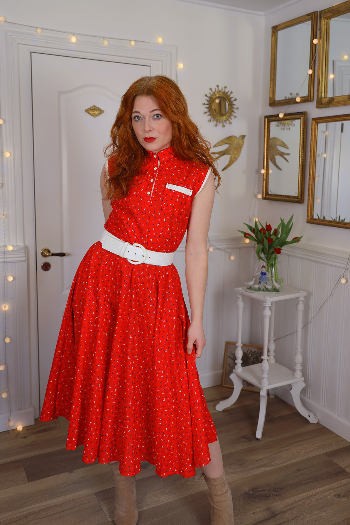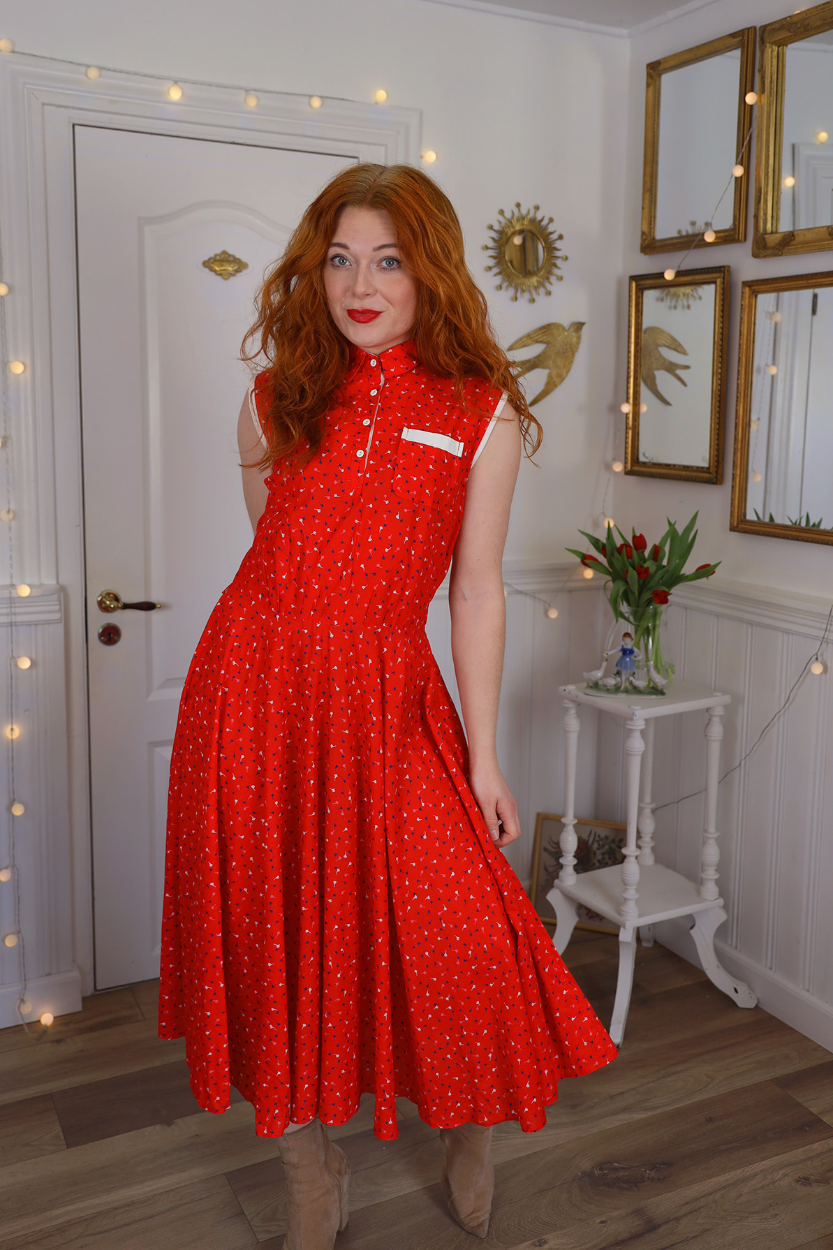 Red vintage dress with blue and white flowers in the print