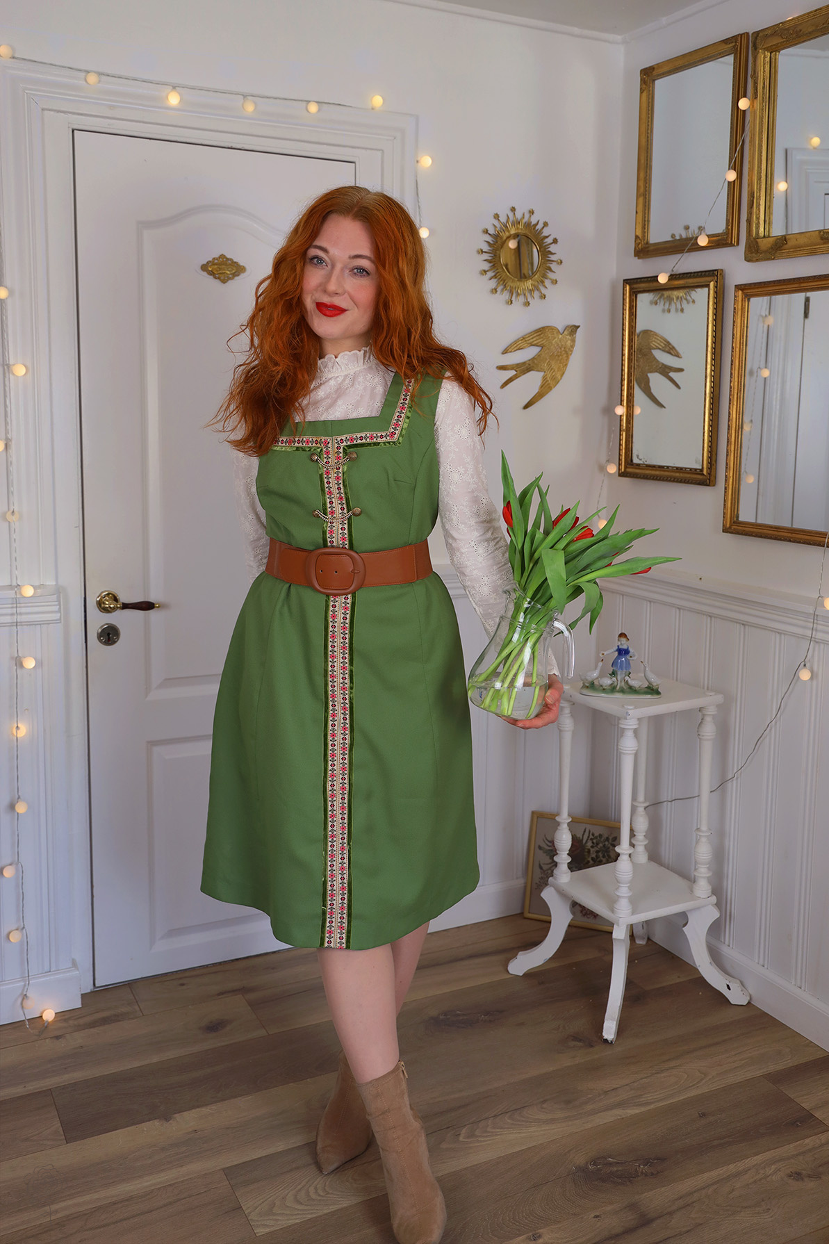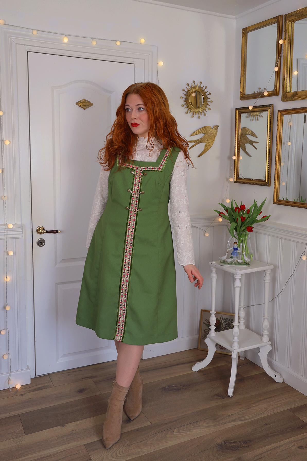Stunning green vintage dress with floral ribbon and gold chains