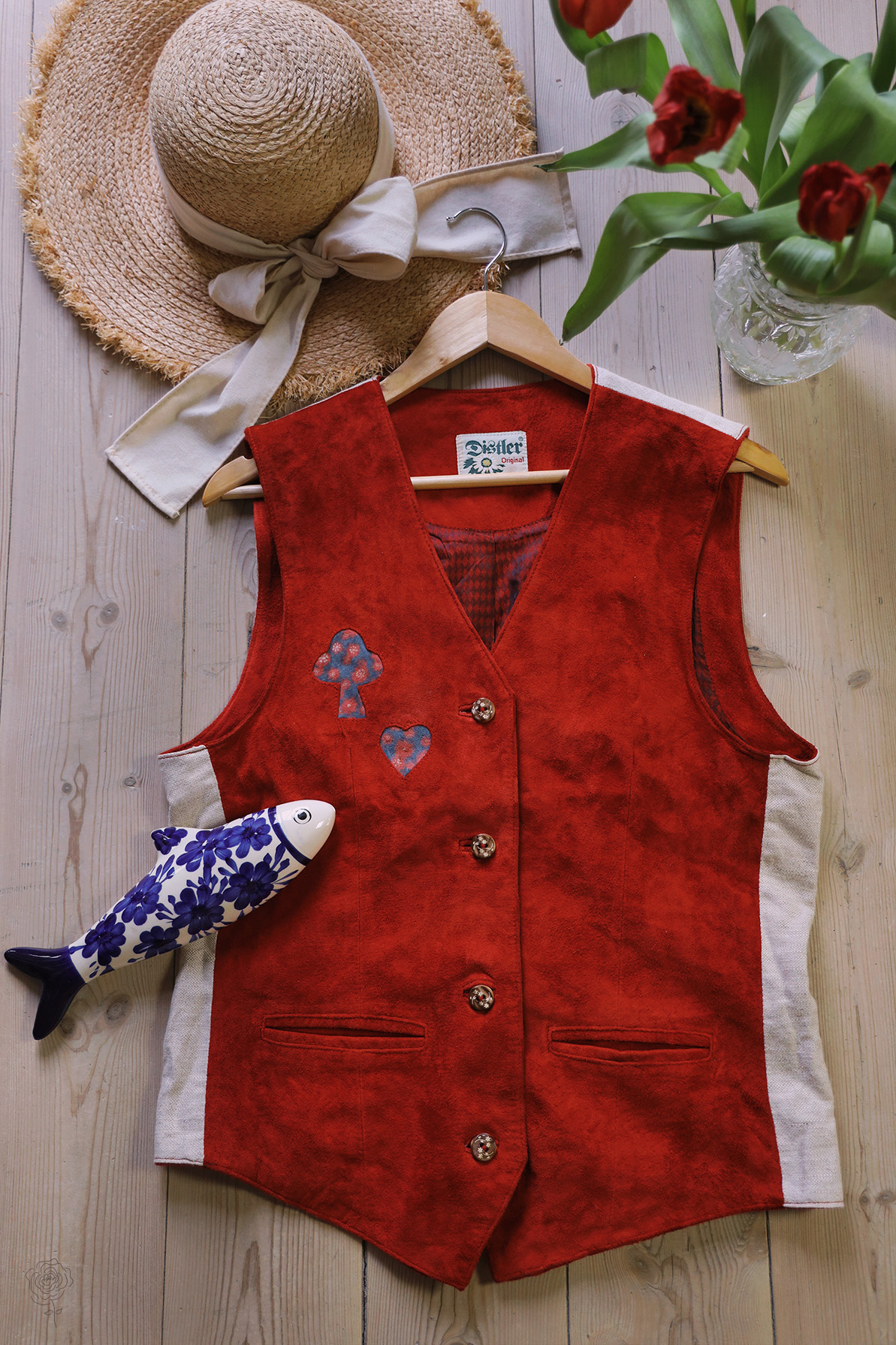 Red suede leather vintage waistcoat with sand linen backpiece.