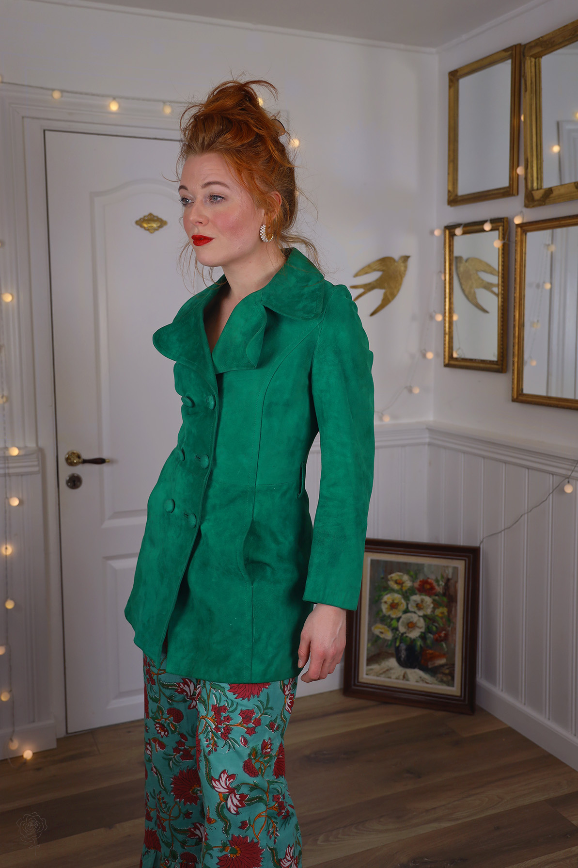 Stunning green suede vintage jacket with matching suede leather buttons on the front and pockets