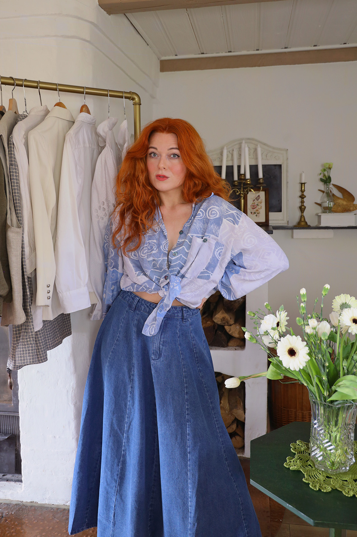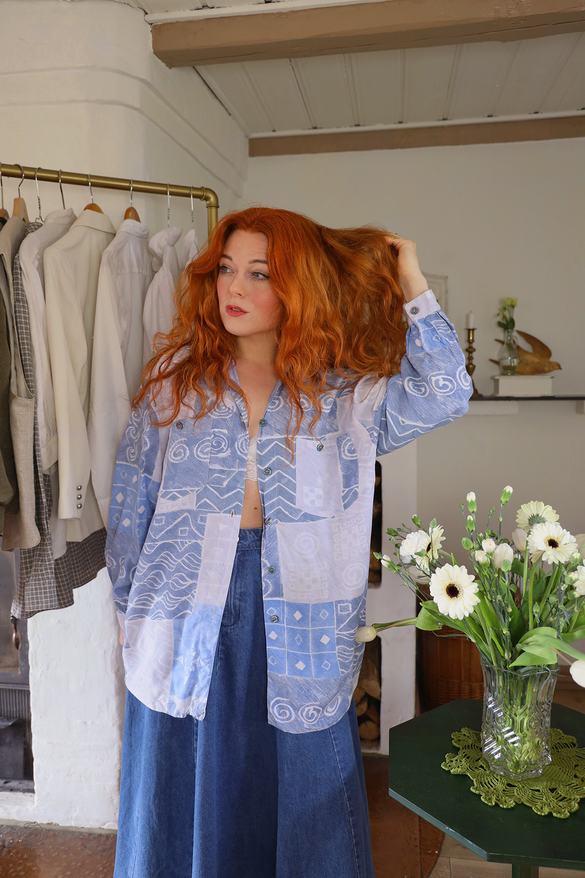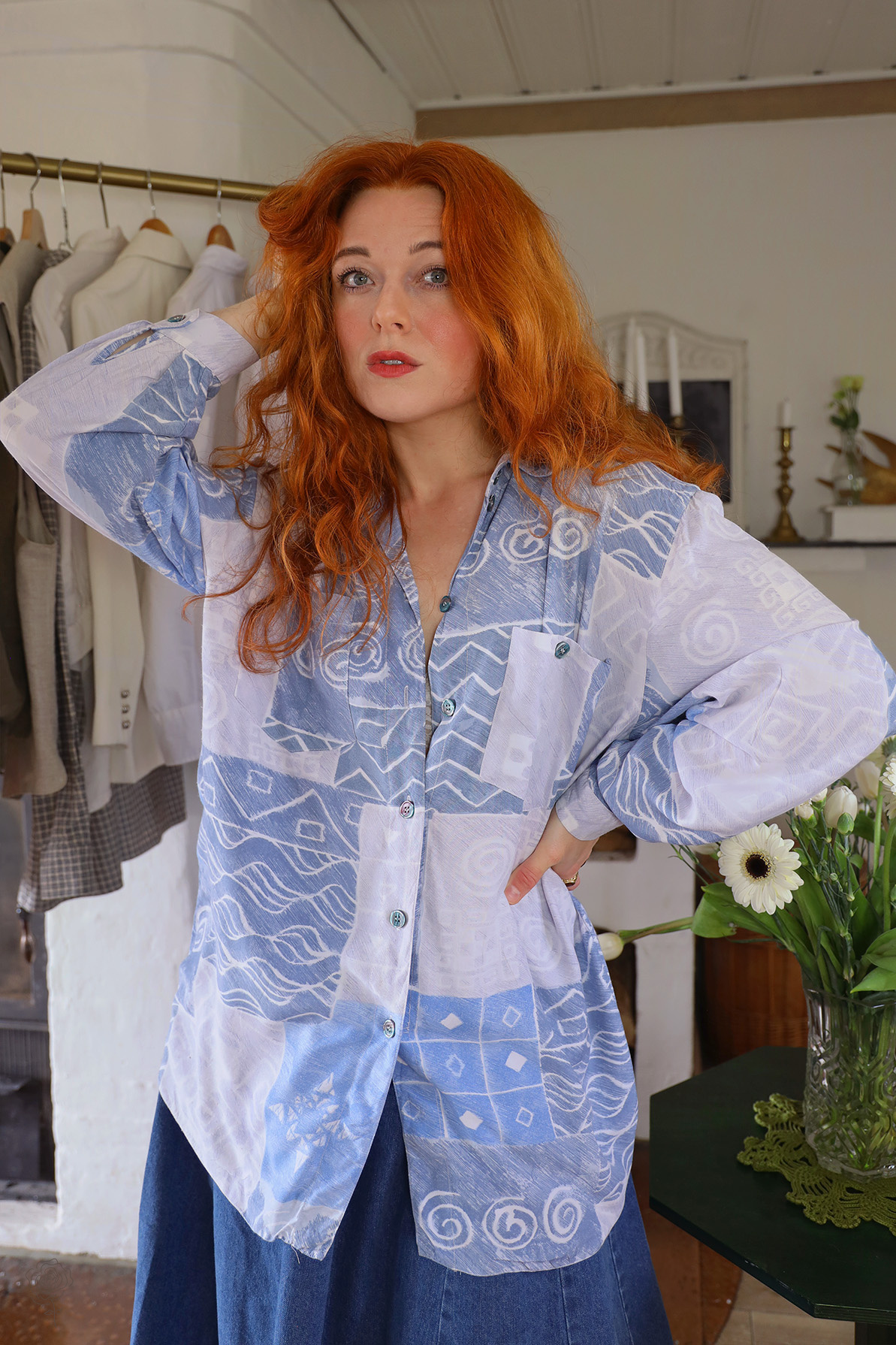 Blue 90’ beach coverup vintage blouse with buttons down the front and breast pocket