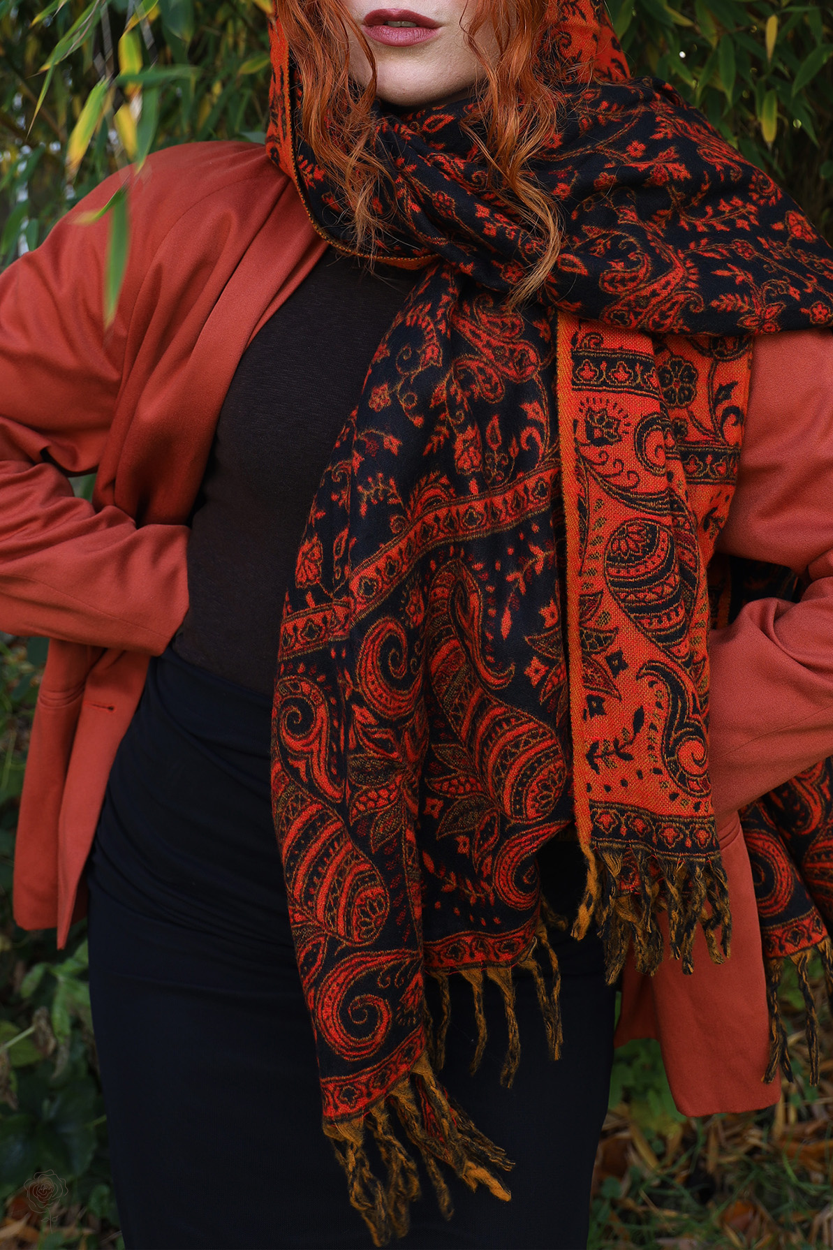Warm orange scarf or blanket, with one side being mainly orange with black flowers and the other side in reversed colour scheme.